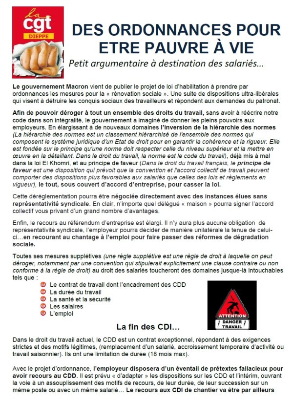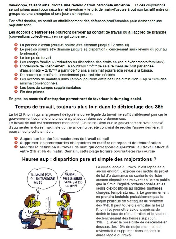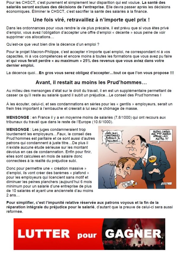 Nous refusons d’ores et déjà d’entendre dire fin septembre que les ordonnances, présentées par le Gouvernement, auraient été co-élaborées avec les syndicats. C’est pourquoi notre organisation a lancé une campagne d’information, de débat mais aussi de mobilisation dans les services, les entreprises et les territoires, dans le public comme dans le privé. Ces initiatives se prolongeront tout l’été car il n’est pas question d’accepter ce marché de dupes.