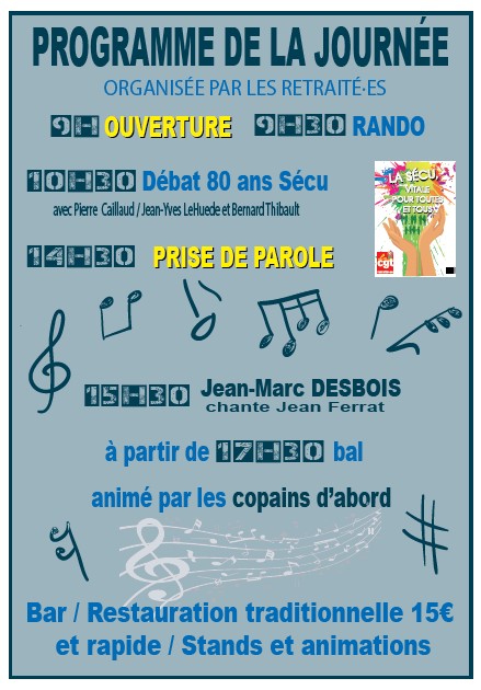 Les échanges débutés lors du débat 80 ans sécu continueront autour des stands dont celui du comité régional CGT Pays de la Loire, celui du comité du souvenir, de l’IHS44... Mais aussi autour d’un verre, d’un repas et de la musique (voir flyer joint)
