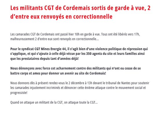 A la suite de ces gardes à vue, 2 militants sont poursuivis en correctionnelle. Ils passeront le 02 décembre à 13 H devant le Tribunal de Nantes. La CGT appelle à un rassemblement de soutien