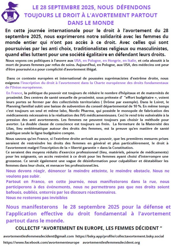 En cette journée internationale pour le droit à l’avortement partout dans le monde, nous exprimerons notre solidarité avec les femmes de tous les pays, avec toutes celles qui n’ont pas accès à ce droit, avec toutes celles qui sont poursuivies par les anti-choix, traditionalistes religieux ou masculinistes lorsqu’elles luttent pour une société égalitaire.