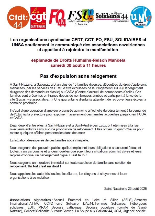 L’UL CGT de St-Nazaire appelle à participer au rassemblement organisé par les associations nazairiennes luttant pour le droit au logement, pour la défense des demandeur·euses d’asile et des "sans-papiers" :