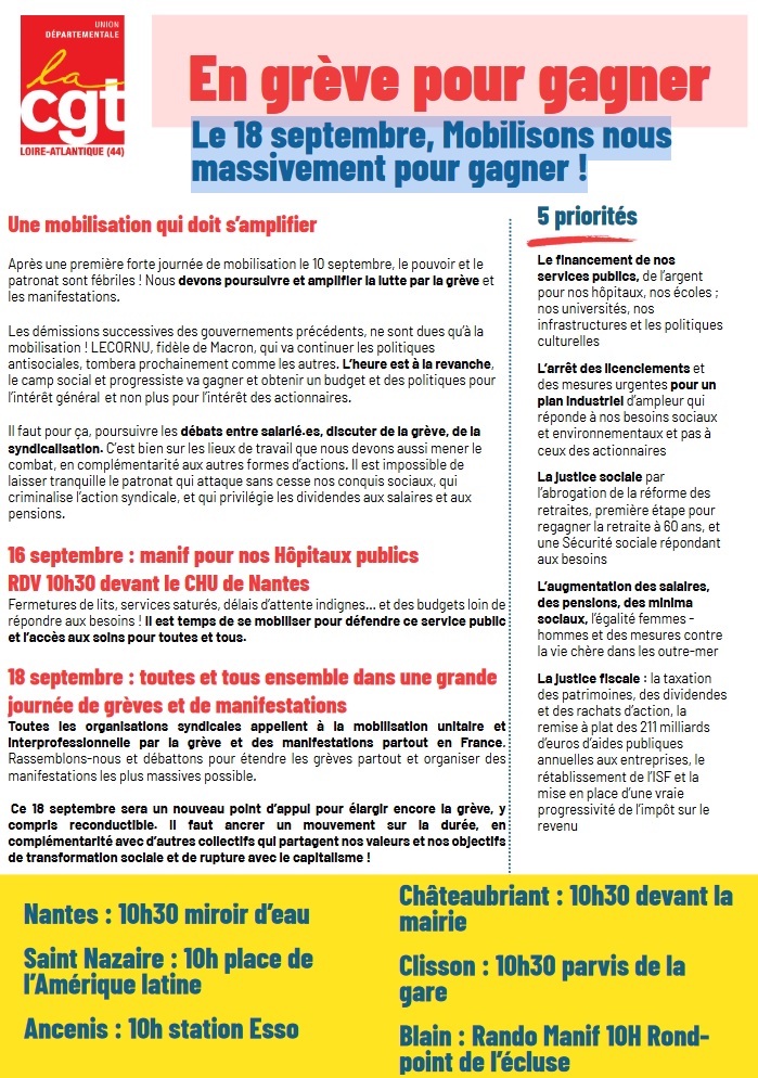 – mardi 16 septembre, 10h30 devant le CHU de Nantes : manifestation pour l’hôpital public et la santé pour toutes et tous doit permettre d’exiger des moyens dans le cadre d’un budget de la sécurité sociale répondant aux besoins.