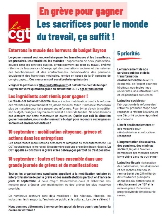 Les nombreuses mobilisations démontrent l’ampleur du mécontentement. La CGT souhaite que le mercredi 10 septembre soit une première étape réussie. La CGT appelle à construire la grève et les débrayages partout où c’est possible.