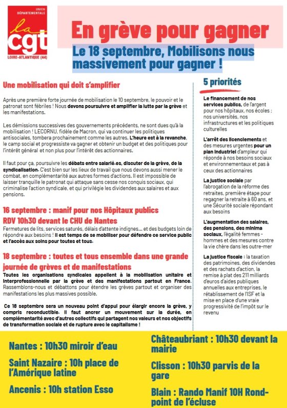 – jeudi 18 septembre, journée nationale et intersyndicale de grève et de manifestations pour exiger la prise en compte des revendications sociales et refuser de nouveaux sacrifices pour le monde du travail,