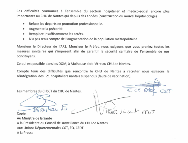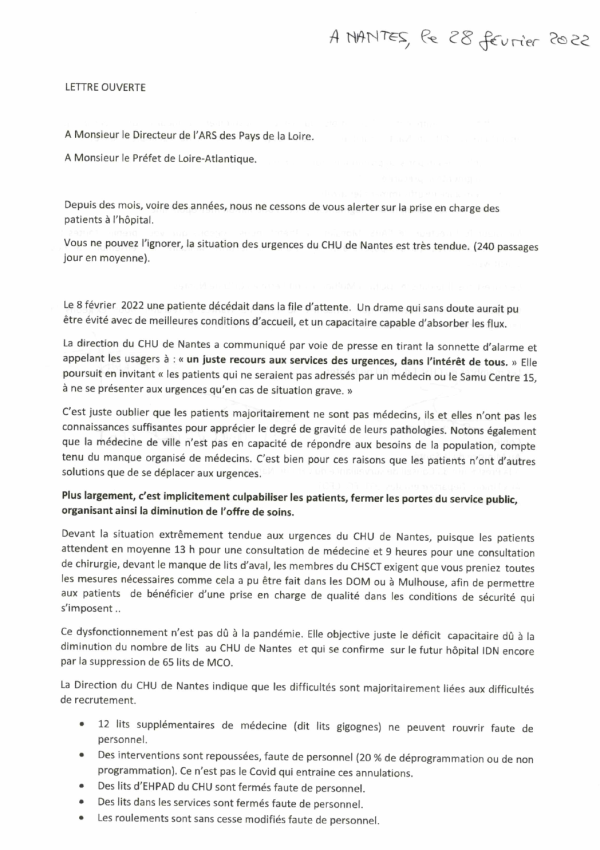 Lettre ouverte des représentants du personnel du CHU Nantes à l’Agence Régionale de Santé (ARS) au sujet de la situation aux Urgences
