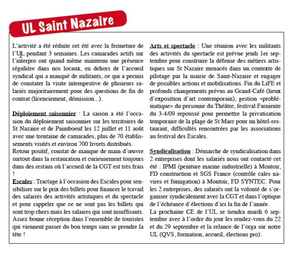 En quelques pages, l’Union locale Saint Nazaire met en avant une partie de l’activité syndicale sur le bassin nazairien. Cheminots, CPAM, Energie, Saisonniers... la CGT s’active.