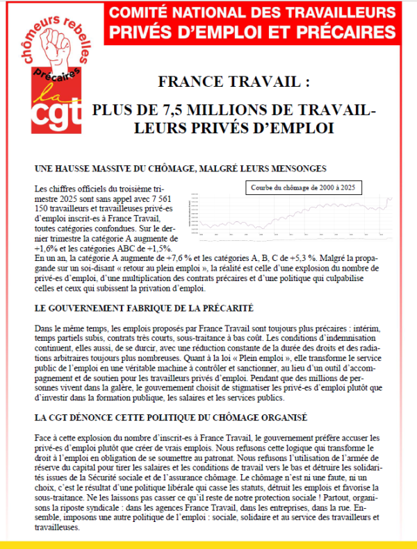 Les chiffres officiels du troisième tri-mestre 2025 sont sans appel avec 7 561 150 travailleurs et travailleuses privé-es d’emploi inscrit-es à France Travail, toutes catégories confondues. Sur le der-nier trimestre la catégorie A augmente de +1,6% et les catégories ABC de +1,5%. En un an, la catégorie A augmente de +7,6 % et les catégories A, B, C de +5,3 %. Malgré la propagande sur un soi-disant « retour au plein emploi », la réalité est celle d’une explosion du nombre de privé-es d’emploi, d’une multiplication des contrats précaires et d’une politique qui culpabilise celles et ceux qui subissent la privation d’emploi.