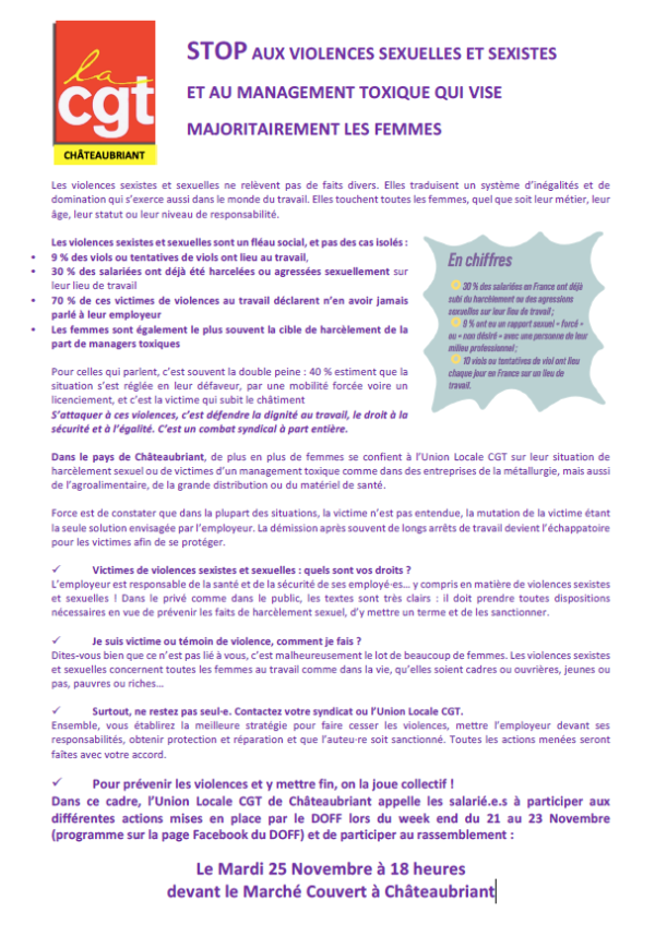 Dans le pays de Châteaubriant, de plus en plus de femmes se confient à l’Union Locale CGT sur leur situation de harcèlement sexuel ou de victimes d’un management toxique comme dans des entreprises de la métallurgie, mais aussi de l’agroalimentaire, de la grande distribution ou du matériel de santé.