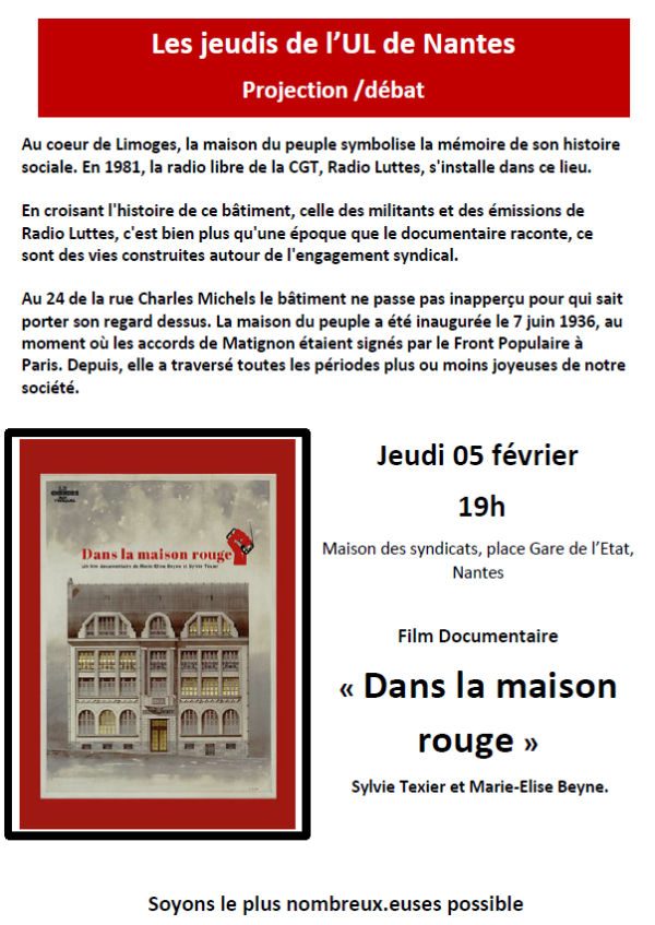 Jeudi 05 février - 19h Maison des syndicats, place Gare de l’État, Nantes