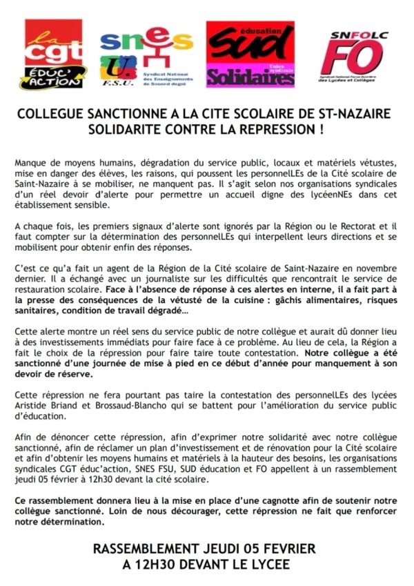 Rassemblement jeudi 05 février à 12h30 devant la Cité Scolaire de Saint Nazaire en solidarité avec un membre du personnel de la cantine sanctionné pour avoir décrit à la presse la vétusté des installations !