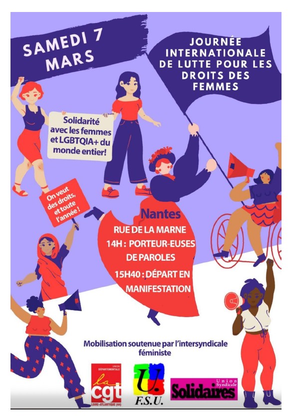 A l’approche du 8 mars, l’intersyndicale féministe CGT-FSU-Solidaires s’est réunie et propose de vous associer à l’initiative du samedi 7 mars à partir de 14h à Nantes, rue de la Marne, avec des porteur-euses de paroles. Ce temps sera suivi d’une manifestation, départ de la manifestation à15h40 de Decré vers Graslin.