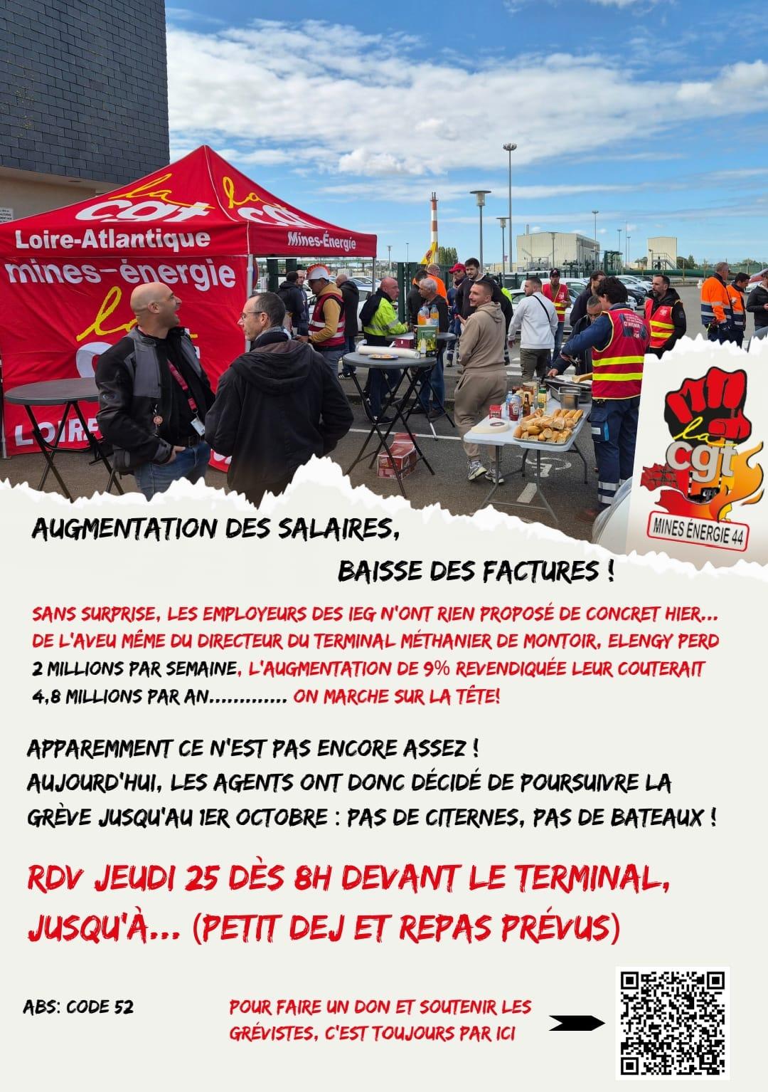 Déjà 4 semaines que les électriciens et gaziers sont en lutte et le mouvement ne faiblit pas avec, notamment mais pas que, le blocage du terminal méthanier de Montoir de Bretagne (44)
