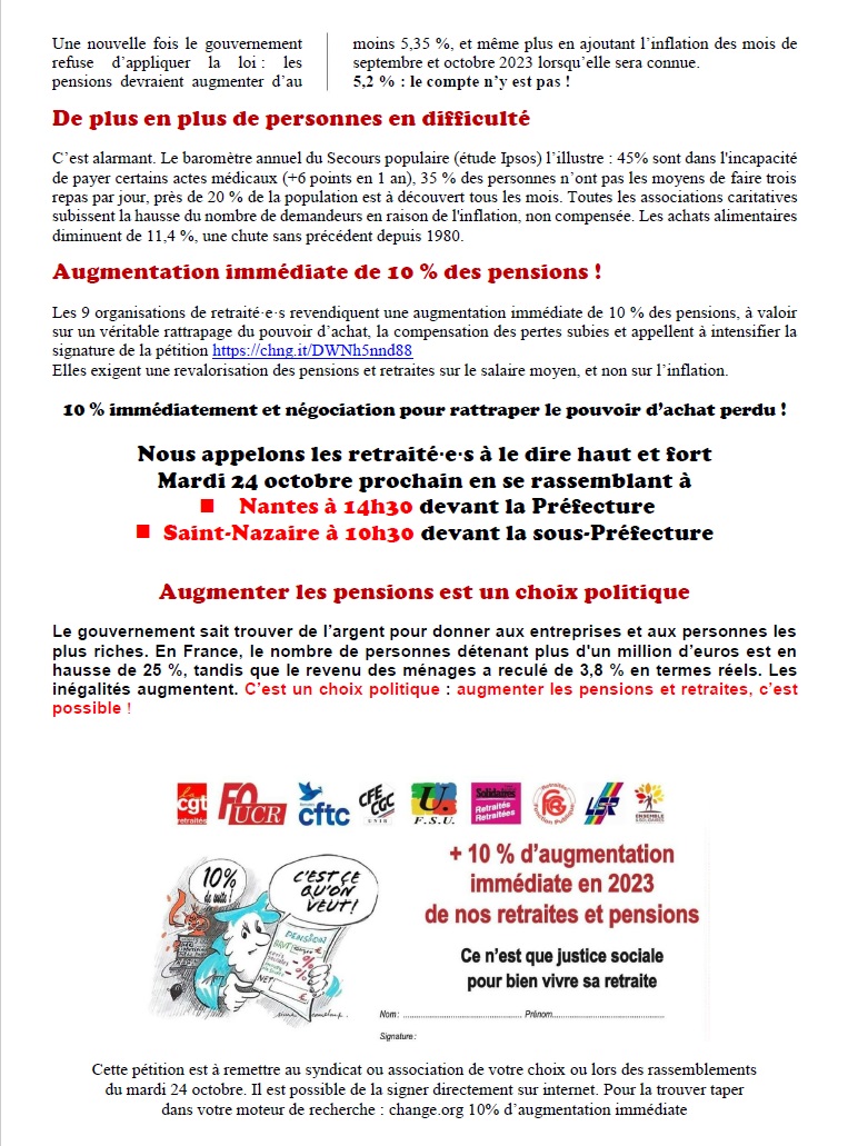 + 10% d’augmentation immédiate en 2023 de nos retraites et pensions