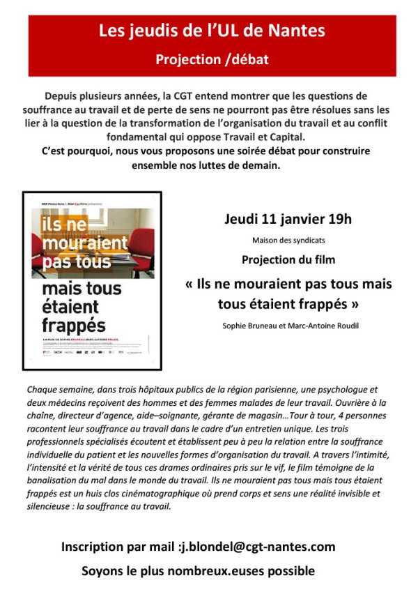 L’Union Locale de Nantes vous propose une soirée débat autour du film ; " Ils ne mouraient pas tous mais tous étaient frappés" de Sophie Bruneau et Marc-Antoine Roudil.