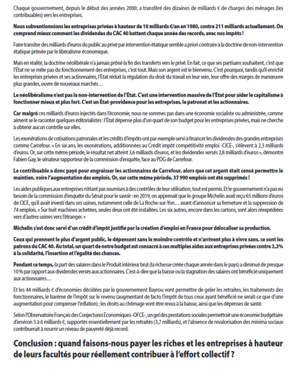 Ceux qui prennent le plus d’argent public, le dépensent sans le moindre contrôle et n’arrivent plus à vivre sans, ce sont les patrons du CAC 40. Au total, un quart de notre budget est consacré à ces multiples aides aux entreprises privées contre 3,2% à la solidarité, l’insertion et l’égalité des chances.